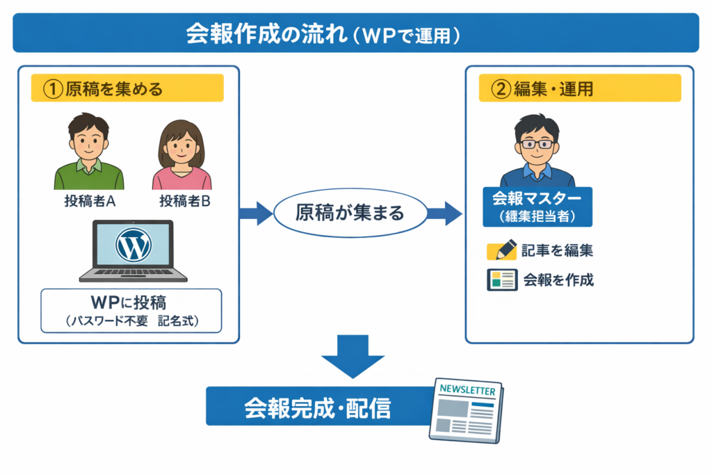ご質問:ご高齢の方でも負担なく続けられる、最新の会報作成システムを考えている。